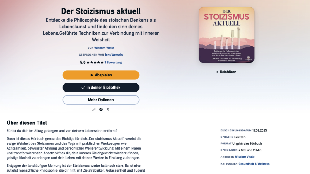 Audiobook for Audible: Der Stoizismus Aktuell from Wisdom Vitale, produced by ExplorerAUDIO, read by Jens Wessels